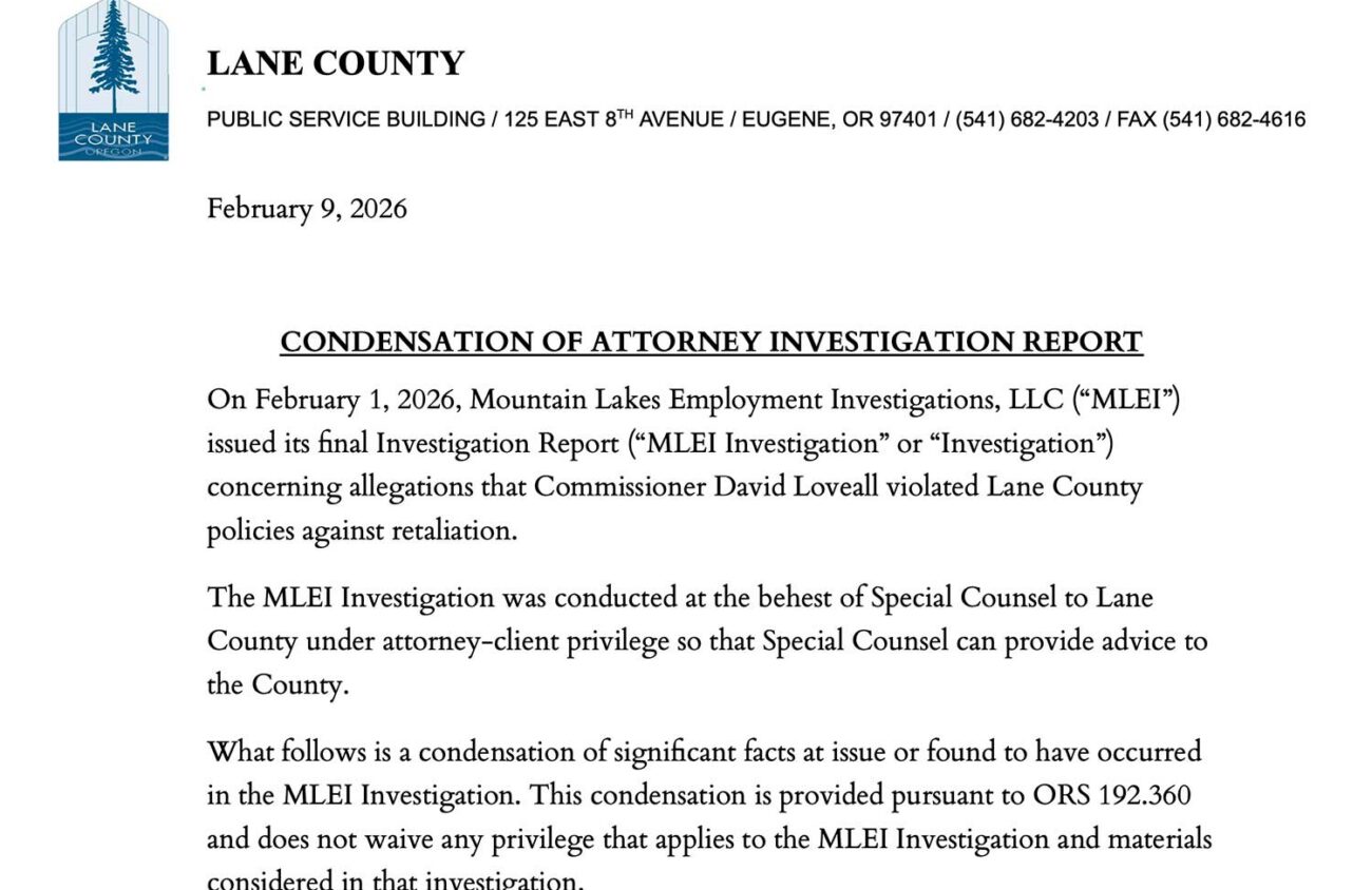 On Feb. 10, Lane County released a summary of a “months-long outside investigation regarding claims of Commissioner David Loveall retaliating against Lane County staff.”