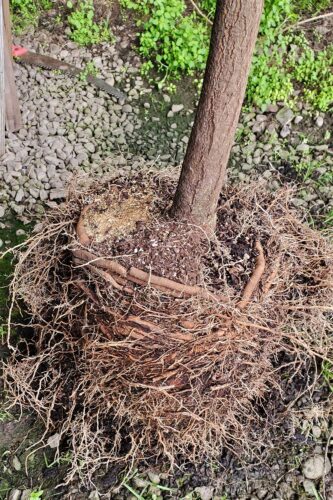 Next, you should be able to see the flare of the trunk (natural widening of the base of the trunk as it leads to the main roots) right above the level of the soil in the container or the ball and burlap. If not, it is likely buried and will often lead to the formation of girdling or circling roots. If the tree easily slides off the container so you can inspect the root ball, you are good. If the tree doesn’t slide easily and the root ball already shows roots circling as they hit the inside of the container, it is not a death sentence, but definitely something you will need to deal with before planting.